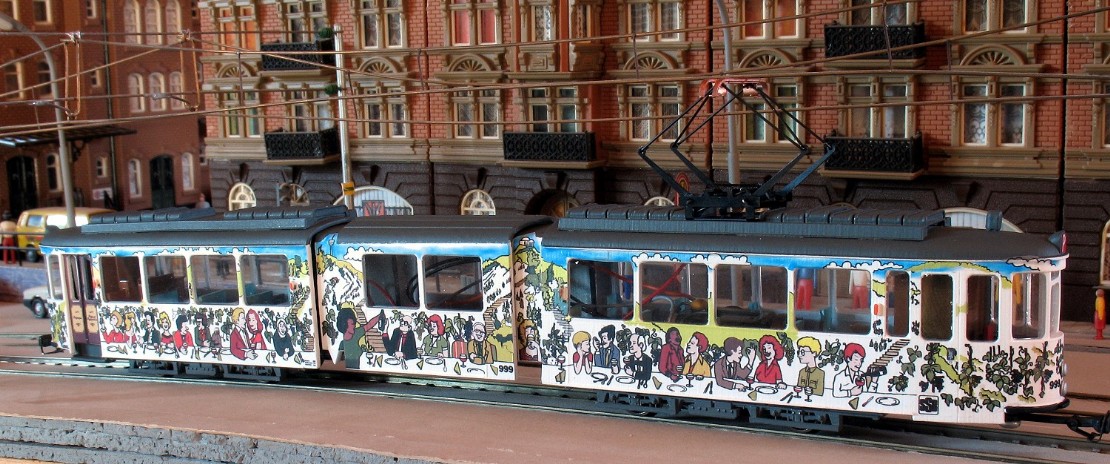 In Zusammenarbeit mit einem weiteren Hobbykollegen entstand das Modell des umgebauten Partywagens 999 als 3D-Druck. Für die vorbildgerechte Dekoration war eine aufwendige grafische Ausarbeitung mit Vektorgrafik, basierend auf zahlreichen Bildern des noch heute im Stuttgarter Straßenbahnmuseum stehenden Originals, fällig. Daraus entstand ein sehr detailreicher Decalbogen, der beim Modell ein optisch sehr ansprechendes Aussehen ergab, auch wenn es sich betriebsbedingt um ein vom Vorbild abweichendes Normalspurmodell handelt.